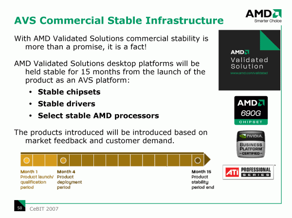 Вполне естественно, что нынешний 15-месячный цикл «стабильной коммерческой платформы от AMD» (с марта 2007 по май 2008 года) строится вокруг чипсета AMD 690G. Именно платы на этом чипсете получают статус сертифицированных и на них распространяются соответствующие программы маркетинговой и технической поддержки для производителей компьютеров и корпоративных потребителей. Впрочем, это не означает, что NVIDIA останется не у дел до упомянутой даты, с выходом соответствующих продуктов, они также будут сертифицированы в рамках NVIDIA Business Platform, активно поддерживаемой AMD, а возможно, попадут и в очередной 15-месячный цикл AVS, стартующий в октябре 2007 года (возникающее, таким образом, перекрытие циклов объясняется необходимостью иметь в портфеле несколько решений с разной функциональностью, отличающихся в том числе и ценой).