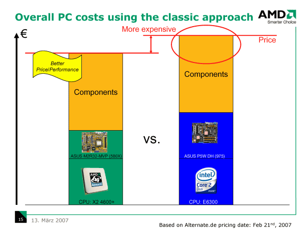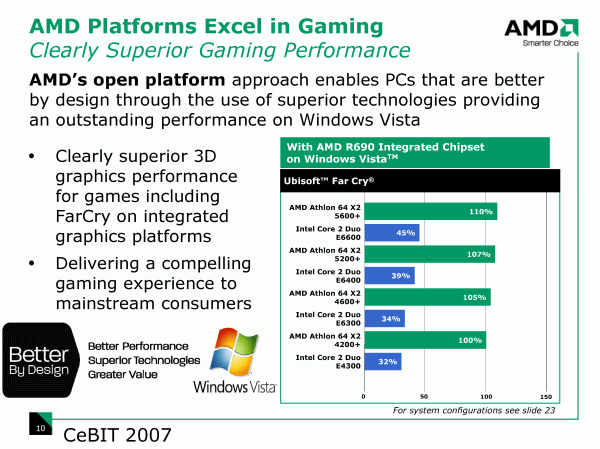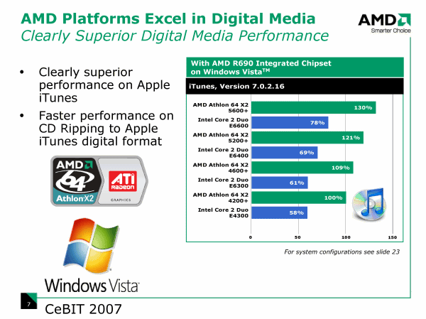 С учетом преимущества графического ядра в чипсете AMD 690G перед Intel G965, которое, конечно, в задачах, связанных с нагрузкой на видеоподсистему, перекрывает разницу в производительности процессоров, AMD имеет право заявлять, что при условии использования интегрированной графики (а это, как было установлено выше, подавляющее большинство компьютеров), приобретение AMD-платформы может быть существенно выгоднее.