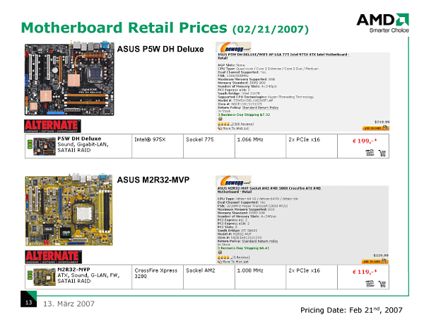 Но и это не все, сравнивая платформы с дискретными чипсетами и системными платами с примерно равной комплектацией и функциональностью, практически для всех сегментов рынка, оказывается, что система в сборе под Core 2 Duo стоит дороже. Добавим от себя, что ситуация не спешит выравниваться, так если обратить внимание на современную линейку чипсетов NVIDIA (как нейтрального производителя, выпускающего похожие решения для обеих платформ), можно убедиться в том, что даже согласно рекомендованным ценам, равные по функциональности модели оказываются оцененными по-разному, в то время как в рознице ситуация дополнительно усугубляется дефицитом.