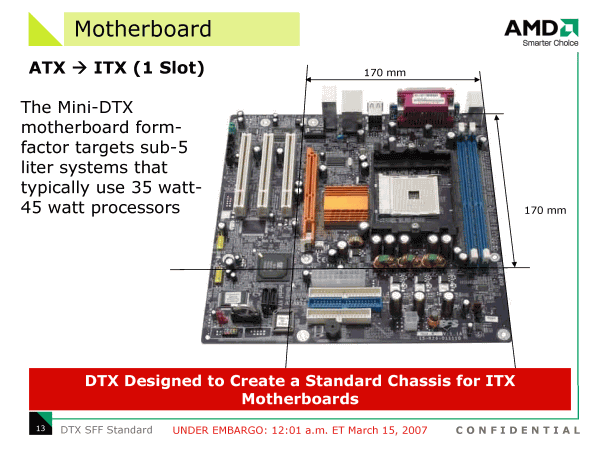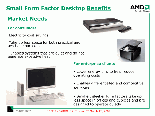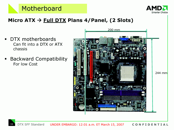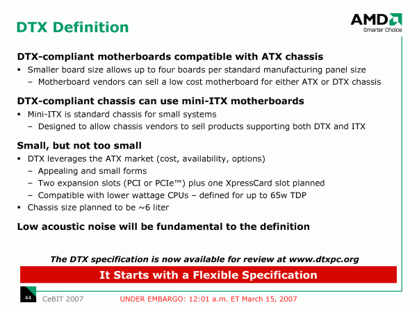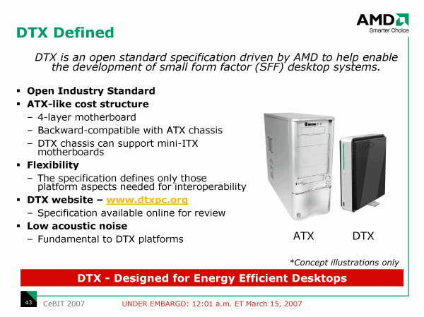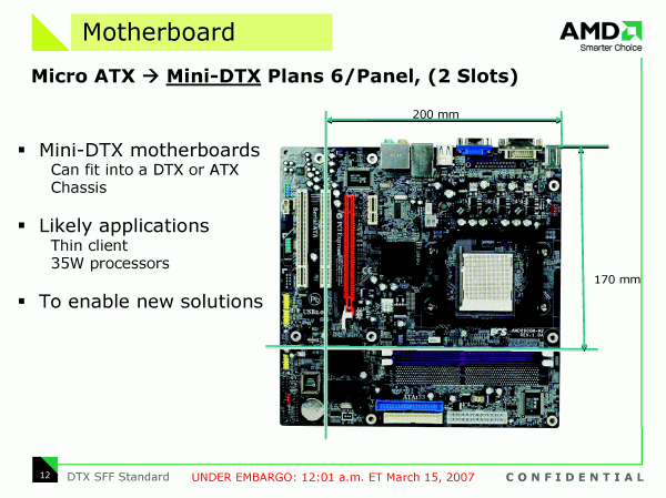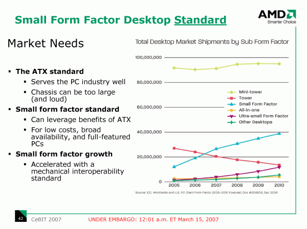 Но официально представленной в рамках CeBIT новацией совершенно неожиданно оказался не графический и не центральный процессор, и даже не чипсет, а стандарт корпусов и системных плат для компьютеров в компактном форм-факторе (SFF). Очевидно, с покупкой ATI, компания AMD почувствовала свою ответственность за судьбу отрасли в целом!