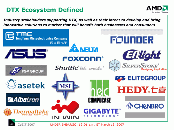 Слайд, пожалуй, в наибольшей степени подтверждающий серьезность намерений. В списке поддержавших DTX видим практически все компании, от которых мы привыкли ожидать выпуска оригинальных корпусов, системных плат и готовых платформ.