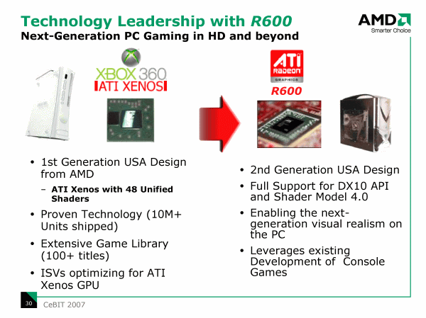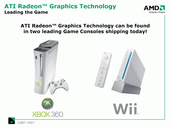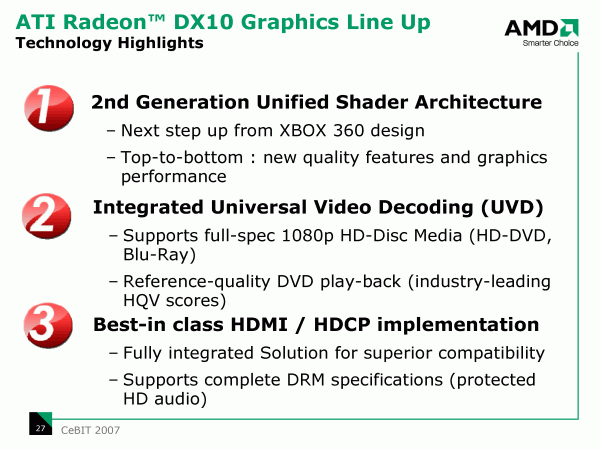 Скоротать время в ожидании процессорных анонсов компьютерной общественности предлагается в тестах и обсуждении (а для самых прогрессивных индивидов — и в непосредственном применении на практике) видеокарт на графическом процессоре AMD R600, о котором внимательным читателям также известно уже немало подробностей, а официальный выход должен состояться в мае. Характерно, что на CeBIT обсуждались в основном вопросы не связанные с непосредственным «мерянием fps» с конкурирующей линейкой NVIDIA, судя по всему, официальная позиция в явной форме не противопоставлять NVIDIA свои решения, распространяется не только на чипсеты. Это, конечно, не означает, что AMD не будет продвигать видеокарты на своих процессорах и замалчивать их достоинства.
