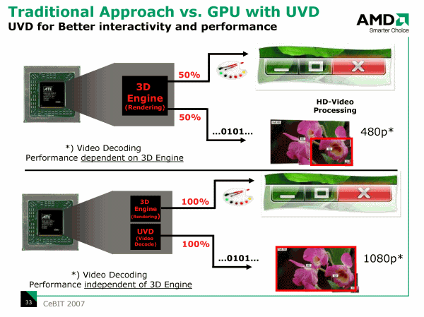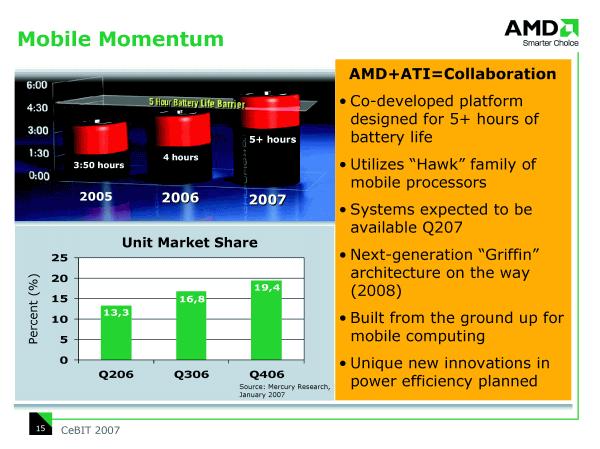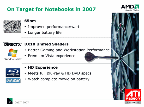 Мобильная графика в 2007 году также получит универсальную шейдерную архитектуру с поддержкой DirectX 10 и возможностью проигрывать Blu-ray и HD-DVD, а благодаря использованию 65 нм техпроцесса, посмотреть целый фильм вы сможете на одном заряде батареи.