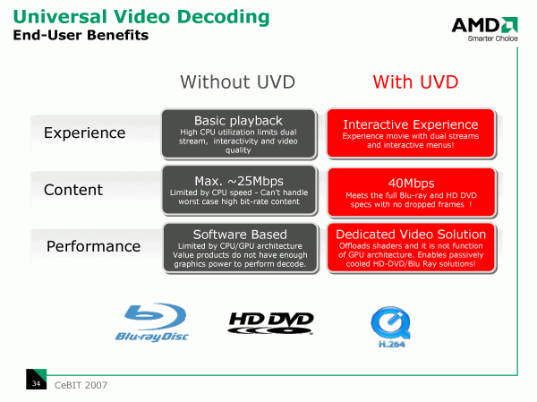 Преимущества такого подхода должны обнаружиться при декодировании параллельно двух видеопотоков, а для воспроизведения высокобитрейтных записей на фоне пользовательской активности в Windows Vista выделенное решение напрашивается само собой. Судя по тому, что речь идет не только о дорогих продуктах, ядро UVD появится и у бюджетных карт, и, не исключено, в следующем поколении интегрированных чипсетов с поддержкой DirectX 10.