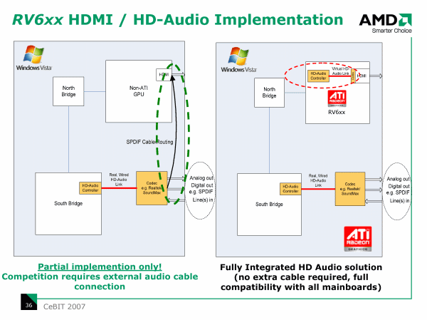 Через интерфейс HDMI передается не только видео, но и звук, однако, желая воспользоваться этой возможностью для подключения своего домашнего кинотеатра, сегодня приходится позаботиться о подключении цифрового выхода со звуковой карты или материнской платы к видеокарте. Поскольку аудиокодеки весьма дешевые, в AMD решили не мелочиться, а поставить такой кодек прямо на видеокарту. Приятная мелочь, не требуется подключение внутренних кабелей, заодно обеспечивается декодирование защищенного HD Audio-вещания в формате DRM.
