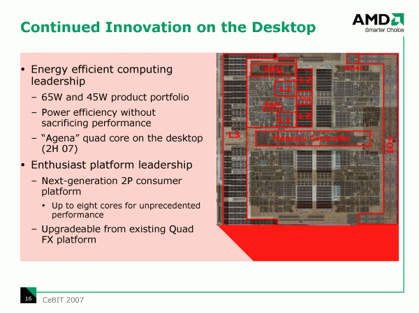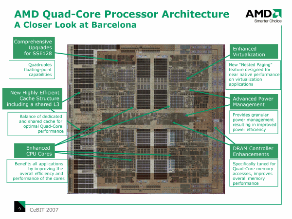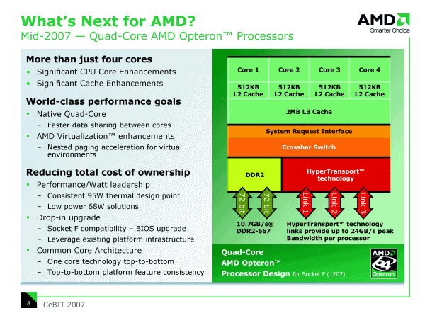 Все, кто следит за новостями по процессорной тематике, уже не раз видели функциональную схему готовящихся четырехъядерных процессоров AMD. Добавить можно лишь несколько, ранее не акцентировавшихся моментов — частота каждого ядра будет выбираться драйвером Cool'n'Quiet независимо, и определяться текущей нагрузкой на данное ядро, более того, контроллер памяти в процессорах сможет автономно обслуживать запросы к своему массиву памяти от других процессоров в многопроцессорной системе (при этом хотя бы и все 4 ядра могут находиться в спящем режиме). В сочетании с заявленным TDP, равным 95 Вт для массовых моделей и 68 Вт для процессоров с пониженным тепловыделением, и, не забывая, что этот параметр по традиции измеряется у AMD в условиях максимальной нагрузки и в среднем на 10—20% является более жестким по сравнению с аналогичной оценкой по версии Intel, компания AMD явно собирается продолжать эксплуатировать козырь экономичности при продвижении новых процессоров.