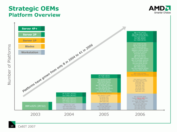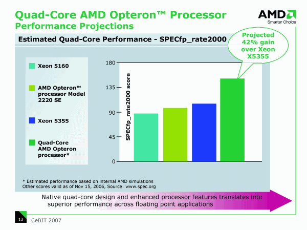 Разумеется, на выпуск четырехъядерного процессора возлагаются вполне определенные надежды (как минимум, возможность продавать старшие модели семейства не дешевле конкурента). Однако в серверном сегменте, наверное, в наибольшей степени реальная производительность зависит от платформы в целом, а не только от процессора, и здесь конкурентоспособность решений AMD никем особо не оспаривается, а число платформ, предлагаемое десяткой крупнейших производителей серверов, растет во всех сегментах.