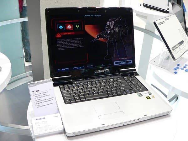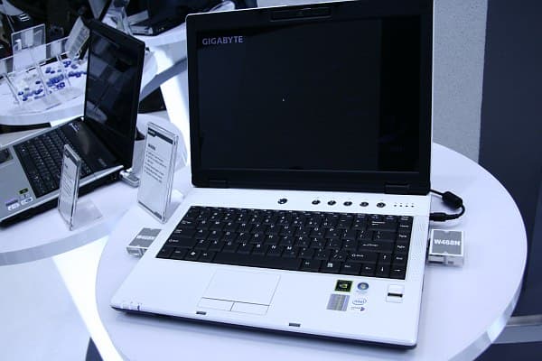 Изучив всесторонне продукты MSI, логично завершить осмотр стенда его, идеологически наиболее близкого, конкурента — компании Gigabyte. Об основных новинках мы уже рассказывали, но, например, до ноутбуков не добрались, а здесь у Gigabyte, как и у большинства производителей ноутбуков на нынешнем CeBIT, демонстрировались модели на платформе Intel Santa Rosa, и, как гласил пресс-релиз, не только! С последним у обозревателей почему-то возникла путаница и, в результате, многими к семейству Santa Rosa был причислен даже новый флагман линейки ноутбуков от Gigabyte.