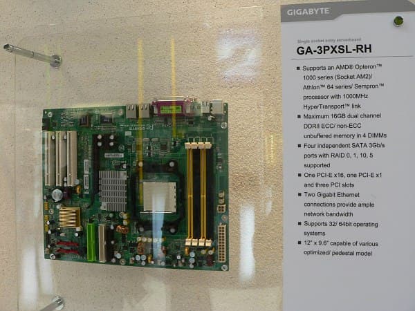 Из оставшихся без внимания системных плат, хотелось бы остановиться на 3PXSL-RH, пополнившей серверную линейку (в которую Gigabyte совершенно справедливо включает одно- и двухпроцессорные модели, оставляя более сложные многопроцессорные варианты специализирующимся на такой продукции компаниям), на чипсете GeForce 6150 + nForce 430. Как и ожидалось, через некоторое время после выхода процессоров для серверного разъема Socket F, начальные модели Opteron перекочевали и на Socket AM2, как в свое время с Socket 940 на 939. Плата рассчитана именно на такие процессоры (Opteron 1000 серии). На плате реализованы все функции, характерные для чипсета, поддерживается установка 16 ГБ DDR2-памяти (ECC/non-ECC), имеется два гигабитных сетевых контроллера, 4 SATA, 1 PCI Express x16, 1 PCI Express x1 и 3 PCI.