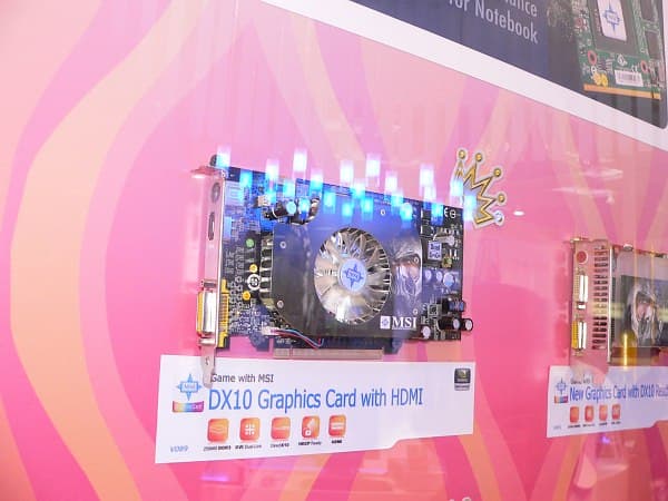 Видеокарта, которую мы ошибочно назвали GeForce 8300 GT, несмотря на свой «усеченный» вид, оказалась 8500-ой. Однако какие-либо характеристики карты выяснить не удалось, остается только любоваться на оригинальное охлаждение от MSI и констатировать, что разъемы HDMI, похоже, становятся неотъемлемым атрибутом недорогих видеокарт, в то время как для дорогих остаются опцией.