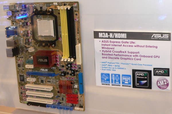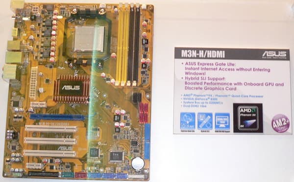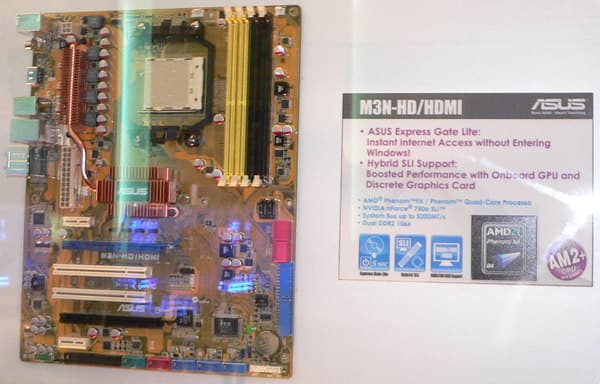 Пристальное внимание инженеры ASUS уделили и только что вышедшим чипсетам с интегрированной графикой для платформы AMD: на чипсете AMD 780G в списке доступных значатся уже три платы. У представленной на фото полноразмерной M3A-H HDMI, несущей на себе три видеовыхода (HDMI, DVI и VGA), есть «сестра», вовсе не имеющая видеовыходов под индексом M3A-78EH. Соответственно, первая плата подойдет для сборки мультимедийного компьютера, где будут использоваться все возможности интегрированного видео. Вторая же может подойти пользователям, желающим приобрести современную полноразмерную плату, но собирающимся в обязательном порядке ставить видеокарту, а возможности интегрированного ядра удастся задействовать лишь в режиме Hybrid CrossFire. Пока сложно сказать, насколько такая идея окажется интересна, скорее всего, все решат цены, если разница будет невелика, большинство пользователей наверняка предпочтет плату, снабженную собственными видеовыходами. Что касается ASUS M3A78-EMH HDMI, то плата с самым длинным названием оказалась самой компактной, однако в части оснащения видеопортами ни сколько не уступает первой, также имея три порта, одновременно из которых допускается задействовать два — любой из цифровых вместе с VGA. Любопытная технология, ссылки на которую вы можете видеть в описании многих плат, называется Instant Internet Access, обещается возможность запустить браузер, почтовую программу и некоторые другие сервисы без загрузки ОС. Детали того, как это будет реализовано (встроено в BIOS?) пока не разглашаются.
