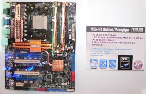 У NVIDIA, как известно, теперь все чипсеты будут содержать интегрированную графику, соответственно, число полноразмерных плат с видеоядром будет стремительно прирастать, ведь для чипсетов, помимо видеоядра, имеющих, например, поддержку 3 видеопортов, формат microATX не слишком подходит. Придется привыкнуть и к тому, что иная такая плата может иметь и весьма шикарное оснащение, как например, ASUS M3N-HT Deluxe/Mempipe на nForce 780a с уже знакомой нам по ASUS M3A32-MVP Deluxe системой охлаждения модулей памяти. Плата на nForce 750a на этом фоне выглядит просто скромно со своим кулером на тепловой трубке и единственным HDMI-выходом. Рассчитывая увидеть на следующей полноразмерной плате чипсет GeForce 8200, поскольку до сих пор у ASUS была лишь microATX-плата (M3N78-EMH HDMI), мы были весьма удивлены, обнаружив на табличке с характеристиками у M3N-H HDMI уже GeForce 8300. Иными словами, эта плата появится в продаже позже двух предыдущих. С другой стороны, это логично, потребители полноразмерных плат традиционно более требовательны, и на сегодня среди плат с интегрированным видео скорее предпочтут платы на чипсете AMD 780G, имеющем более привлекательные характеристики.