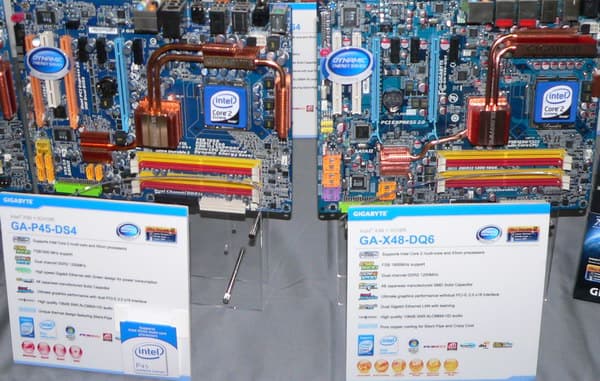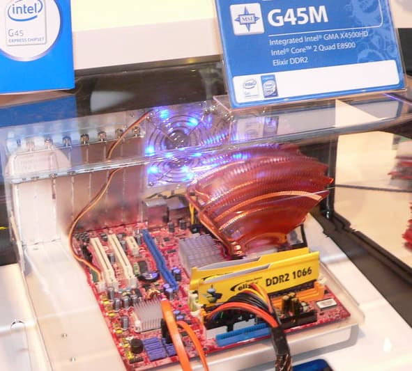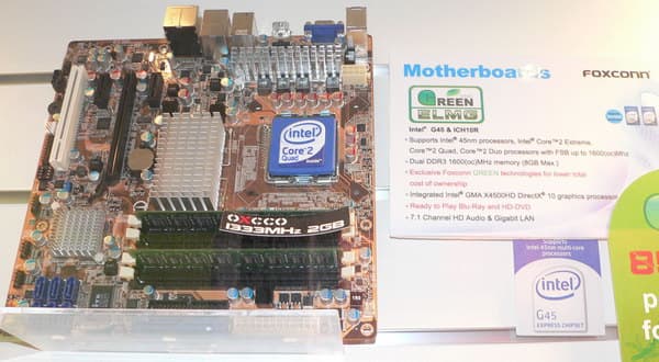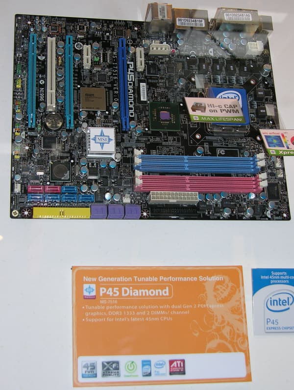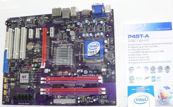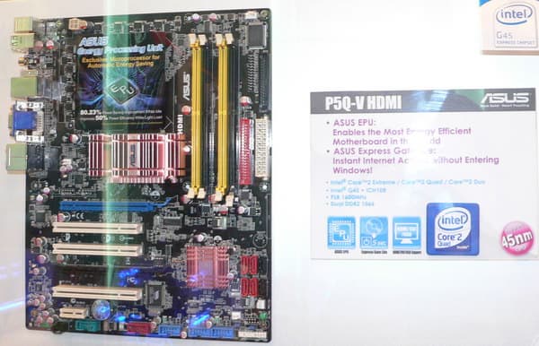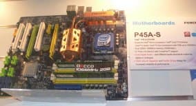 Что касается платы на чипсете G45, готовящемся к выпуску в аналогичные с P45 сроки, то она тоже демонстрировалась вживую, ну а какие-либо инновации вокруг этого чипсета едва ли возможны. В нынешнем (и готовящемся) конкурентном окружении, его уделом будут, скорее всего, скромные офисные машинки.