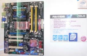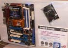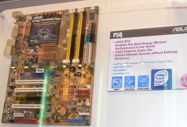 Среди более практичных плат под интеловскую платформу отметим две: P5Q и P5Q-V на чипсетах P45 и G45, соответственно. Однако и здесь не обошлось без оригинальных дополнений, обе платы имеют два порта PCIE x16 (однако о поддержке CrossFire в характеристиках ничего не сказано), первая также получила чипсетный кулер с тепловой трубкой, и в обоих случаях поддерживается технология EFI, что возможно чуть поднимет цену, но сделает платы более экономичными за счет «интеллектуального» управления стабилизатором напряжения.