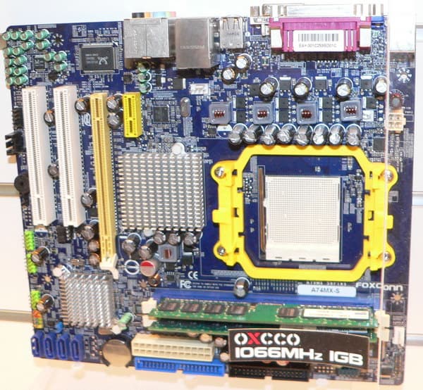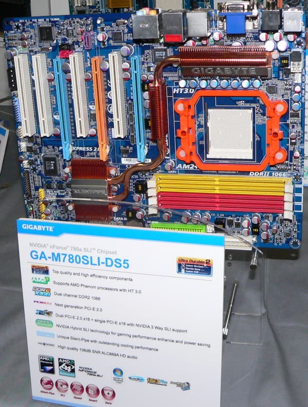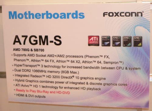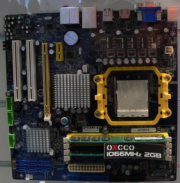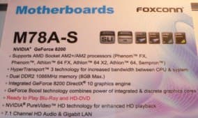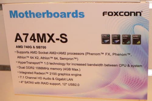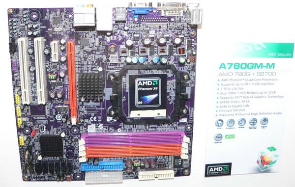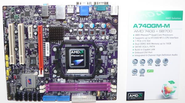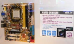Не обошлась экспозиция и без плат на чипсете AMD 780G и его младшем собрате 740G, являющем собой фактически точную копию 690G, переведенного на 55 нм техпроцесс. За кадром осталась еще парочка плат: A7VMX-K и A7VMX-S, внешне идентичных A7GM-S, но на чипсете AMD 780V (с меньшей частотой графического ядра и отсутствием поддержки UVD — выделенного блока декодирования видео). Все платы максимально практичны, однако в качестве видеовыходов у всех без исключения фигурирует DVI и VGA, что весьма похвально.