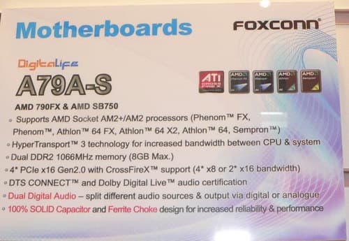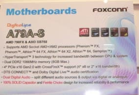 Foxconn едва ли не позже всех выпустил (вернее еще только подготовил) плату на чипсете AMD 790FX, однако в табличке с характеристиками мы зафиксировали весьма примечательный момент, а именно: первое появление на публике южного моста SB750, отличающегося от SB700 поддержкой режима RAID5. Надо отметить, что большинство ныне выпускаемых плат на этом чипсете используют еще более раннюю версию — SB600, хотя придирки к функциональности таких плат неуместны, чему порукой — щедрая порция дополнительных контроллеров. Но возможно у Foxconn получится сделать свою плату более доступной при той же функциональности, сэкономив на дополнительных контроллерах.