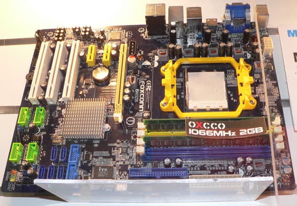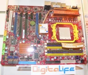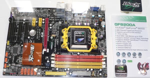 Обнаружилась на стенде и почти полная копия недавно протестированной нами ECS A780GM-A из Black Series, но использующей в качестве основы чипсет GeForce 8200.