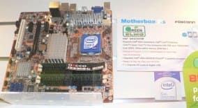 О разнообразных новинках от компании Foxconn мы уже рассказывали в новостях, поэтому не будем повторяться, а лишь запротоколируем оставшиеся неосвещенными моменты. На фото выше: платы на P45 (с парой графических портов и поддержкой CrossFire) и G45 с поддержкой фирменных технологий энергосбережения, которые по заявлению компании при круглосуточной работе такого компьютера уже через несколько месяцев могут окупить переплату в 10% относительно платы, не имеющей такой технологии (в линейке Foxconn будет и простая версия).