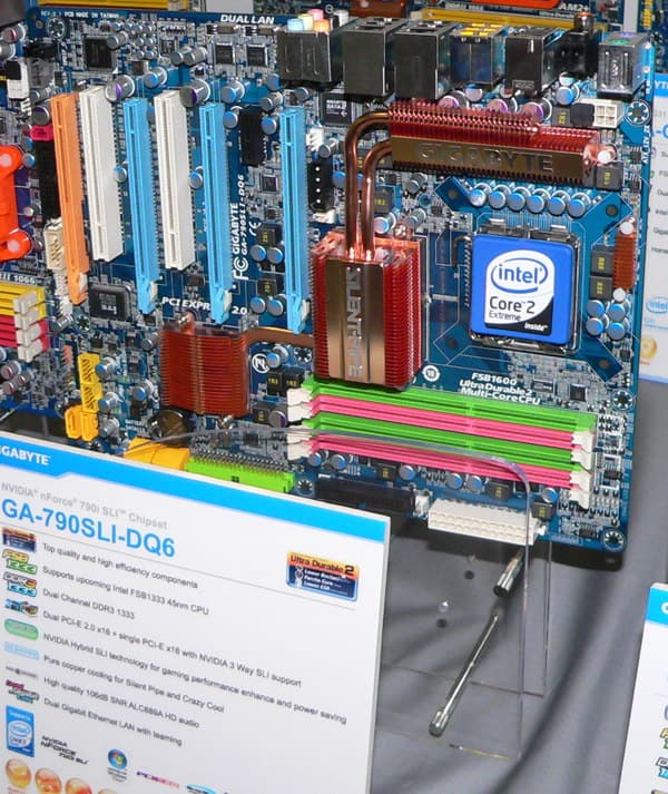 Компания Gigabyte также представила широкий спектр плат на вышедших и готовящихся чипсетах, но помимо технологии DES — динамического управления числом активных фаз у стабилизатора напряжения питания, новые платы отличаются от хорошо нам знакомых представителей серий DS4, DQ6 и прочих лишь новыми чипсетами. Фирменные опции в прежнем составе и в оснащении плат ничего неожиданного.