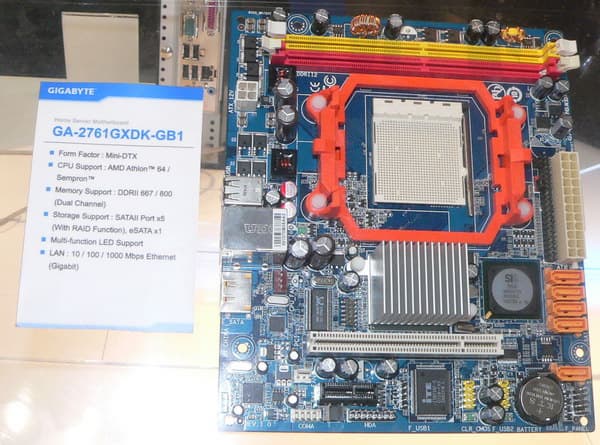 Имеется у Gigabyte и плата в перспективном формате miniDTX, отличающемся от ныне распространенного для встраиваемых решений miniITX возможностью установки двух слотов расширения, но потенциально меньшей себестоимостью за счет упрощения компоновки платы. Поскольку на данной плате применен и довольно дешевый чипсет от SiS, она вполне может оказаться весьма недорогой на фоне в среднем высоких цен на компактные платы такого класса.