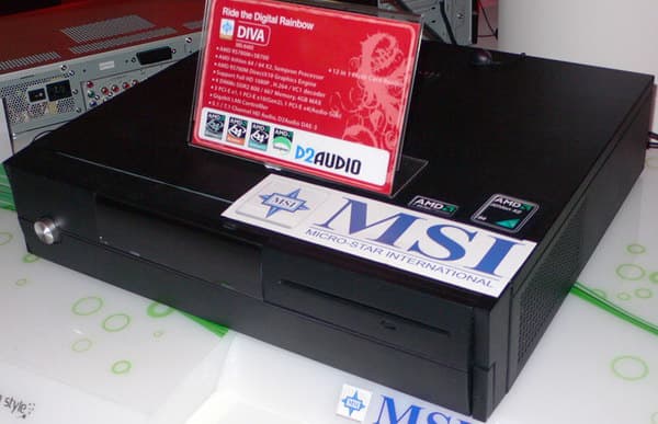 Получает развитие и идея домашнего кинотеатра на базе ПК, который обновляется MSI ежегодно и как раз под CeBIT, нынешняя версия, как и следовало ожидать, получила чипсет из семейства AMD 780, однако не 780G, а мобильную версию — 780M (этого мы точно не ожидали, учитывая что и настольная версия чипсета получилась достаточно экономичной). Несмотря на медиацентровскую внешность и сущность (включая поддержку деокодирования Full HD в форматах H.264 и VC1), расширяемость MSI Diva также заслуживает похвалы, на плате есть графический порт и несколько PCIE x1 (но PCI не предусмотрено), которые допускается занять низкопрофильными картами.