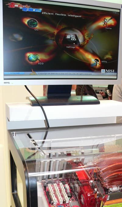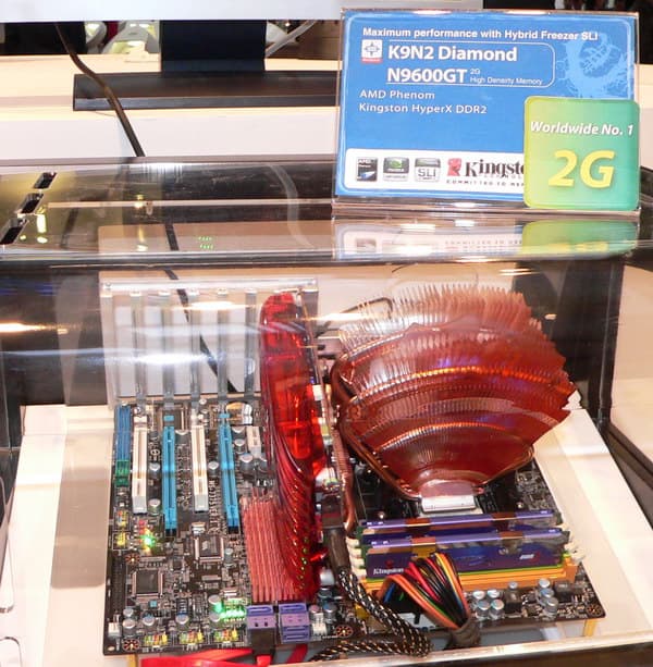 Впрочем, идея становится ясна после взгляда на живую демонстрацию. Судя по всему, MSI планирует представить такие платы как «экономичный» экстрим, ограничение увеличивающих цену опций вполне логично будет продвигать под лозунгом «максимум кадров в секунду за свою цену», как показали наши исследования некоторое перераспределение бюджета с системной составляющей (процессор+плата) в пользу видеоподсистемы сейчас вполне оправдано. А для того чтобы сделать компьютер более дружественным с точки зрения энергопотребления и шума, плата поддерживает технологию Hybrid Freezer SLI, так в MSI назвали функцию, имеющуюся у всех будущих чипсетов от NVIDIA с интегрированной графикой — возможность переключаться на интегрированное видео в 2D, что, в частности, позволяет полностью останавливать вентиляторы на видеокартах (собственно это и демонстрировалось в данном случае, в качестве видеокарты тоже очень любопытная — на 9600GT с 2 ГБ памяти). Кстати, на этой плате мы видим уже привычную для таких моделей систему Circu-Pipe, забавный радиатор с вентилятором на чипсете, как на предыдущем фото, установлен лишь на прототипе платы.