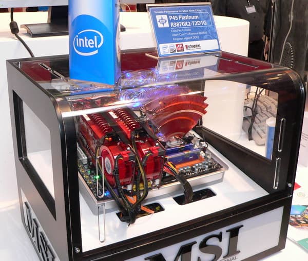 От концептуальных идей переходим, однако, к нашим, мирно пасущимся, баранам. Как известно, основные пастухи-чипмейкеры (Intel, AMD и NVIDIA) велели на сей раз клонировать чипсеты X48, 780G и GeForce 8200, соответственно. Впрочем, помимо перечисленных, мы обнаружили платы и на некоторых чипсетах, только готовящихся к выпуску, ну и разумеется, в каждом конкретном случае оценили, что производитель «хотел сказать» данной платой. В частности, в стенде на этой фотографии, на ординарной в целом плате на чипсете P45, готовящемся к выпуску ближе к лету, MSI решила продемонстрировать работоспособность Quad CrossFire, две видеокарты на Radeon HD3870 X2 трудились в паре весьма убедительно.