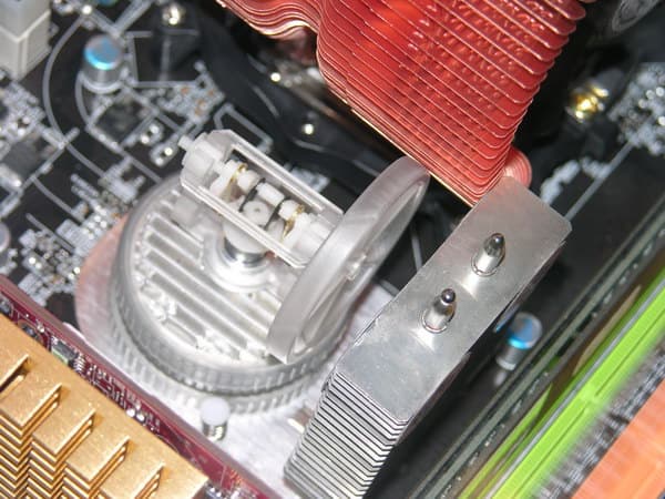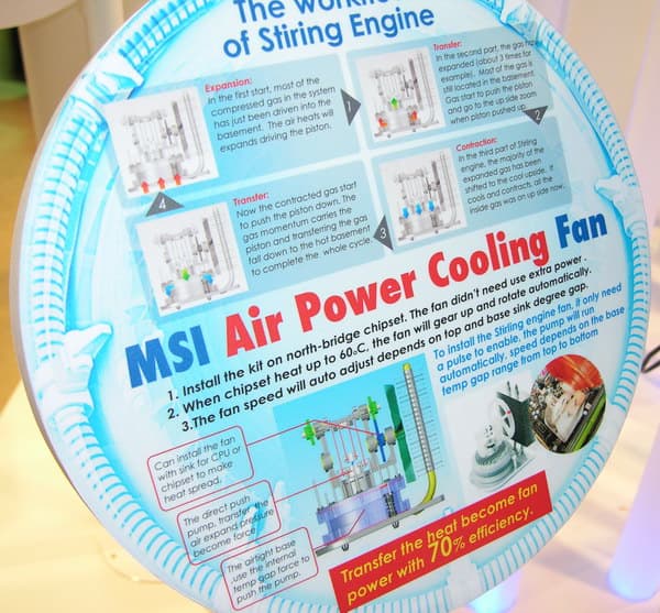 А именно: кулер для чипсета, преобразующий тепловую энергию непосредственно в механическую работу. Циркулирующий вследствии нагрева газ приводит в действие поршень, и вентилятор начинает крутиться, помогая охлаждению дополнительно за счет обдува радиатора.