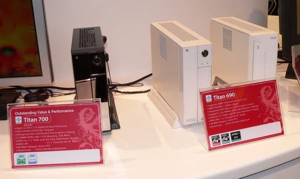 В экспозиции готовых платформ внимание привлекли офисные баребоны Titan, модель Titan 700 с процессором VIA C7-D и чипсетом CN700 и Titan 690 для Athlon 64 и Athlon X2 — на чипсете AMD 690G. При своих габаритах, чуть превышающих размеры типичных «тонких клиентов», это вполне самостоятельные компьютеры, с функциональностью достаточной для офисных нужд.