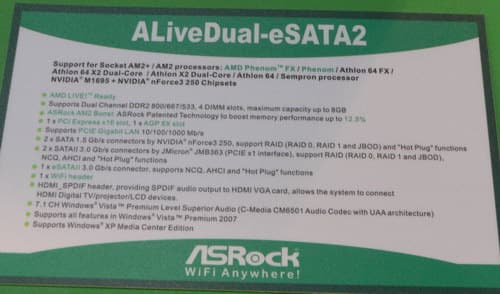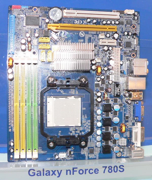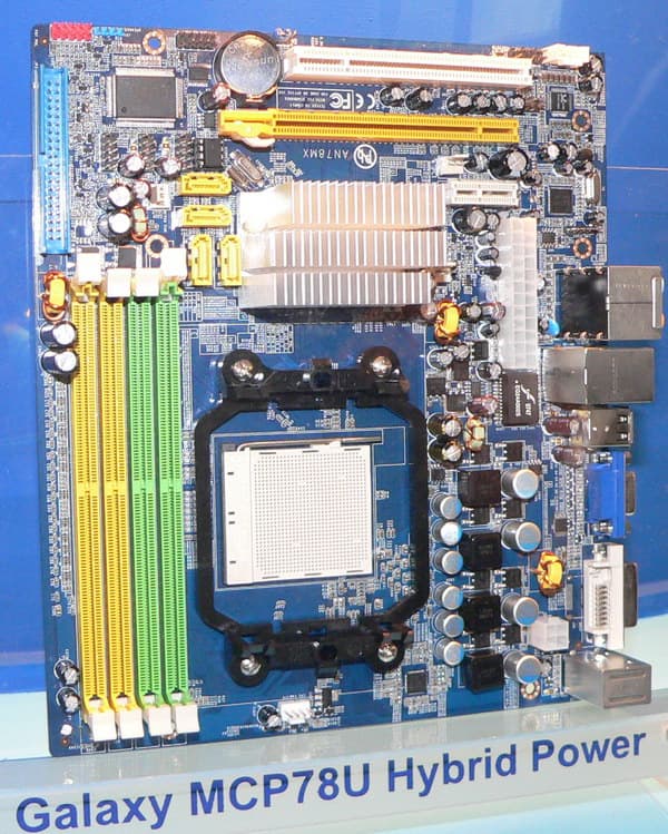 На стенде Galaxy нам пришлось отгадывать загадку, чем NVIDIA MCP78S отличается от MCP78U. Ранее мы были твердо уверены, что первый — это GeForce 8200, а второй — готовящийся к выпуску GeForce 8300, от которого мы ждем повышения производительности и более ничего особенного. Однако в Galaxy почему-то говорят, что отличия между чипсетами состоят в поддержке вторым технологии Hybrid SLI, что решено было даже вынести в название платы. Мы так, прямо скажем, не договаривались, поскольку и в GeForce 8200 такая поддержка была обещана (да и демонстрировалась на соседнем стенде у ASRock). Впрочем, для Galaxy системные платы — продукция новая, и сотрудники на стенде могли просто не разобраться в таких нюансах.