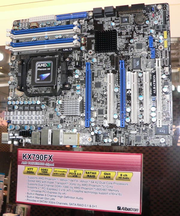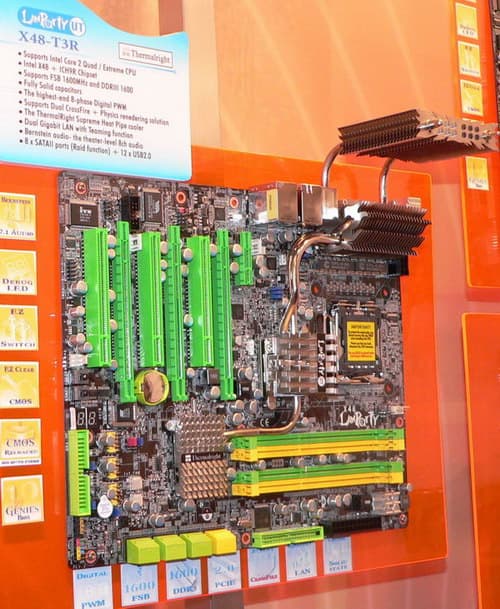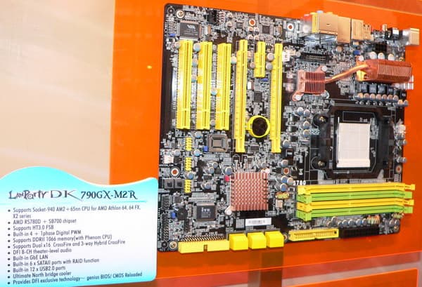 Именно DFI выпала честь показать на своем стенде плату на чипсете AMD 790GX (аналог 790FX с интегрированным ядром), а в ее характеристиках нас больше всего позабавила надпись Ultimate north bridge cooler. Действительно «ультимативный» это не обязательно едва вмещающийся в корпус, в который по последней моде можно заливать воду, жидкий азот или обкладывать еще чем-нибудь покрепче (вроде сухого льда, как рекомендуется в описании одной из плат от Foxconn). Если чипсет не нуждается в интенсивном теплоотводе, можно это свойство и подчеркнуть, например, за счет такой компактной конструкции. Однако, надо ведь подумать и об оверклокерах, у которых DFI издавна на особом счету. Так что вполне возможно, что перед нами только прототип, а релизную плату закуют в более привычную для топовых моделей «броню».