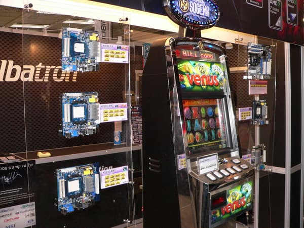 Компания Albatron почти полностью переключилась на выпуск плат в формате Mini-ITX для индустриальных и встраиваемых систем, например, для игровых автоматов, вроде представленного на стенде.
