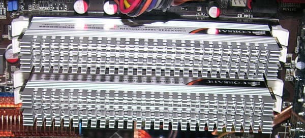 А вот и 4-гигабайтный комплект такой памяти по версии Transcend. Справа комплект емкостью 2 ГБ и частотой 1200 МГц с радиаторами, сделанными в подражание Corsair.