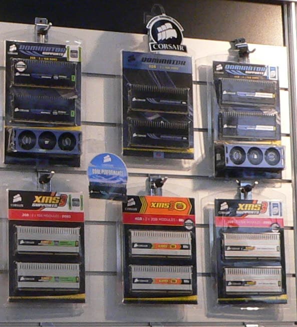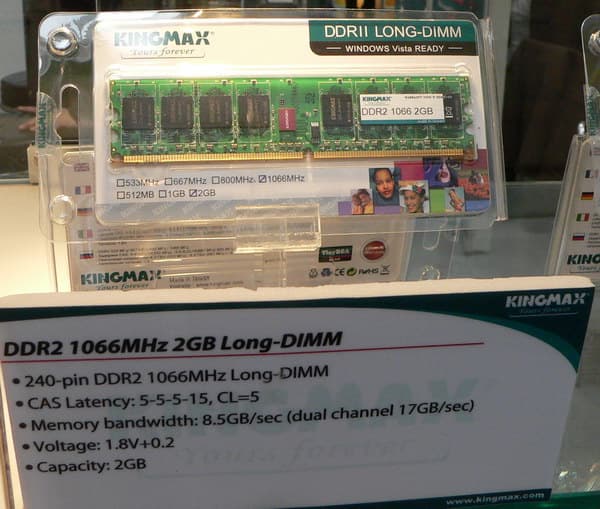 А наиболее интересными новинками в экспозиции Corsair следует назвать двухканальный комплект DDR3-2133 емкостью 2 ГБ с таймингами 8-8-8-24 и 4 ГБ DDR2-1066 с таймингами 5-5-5-18.
