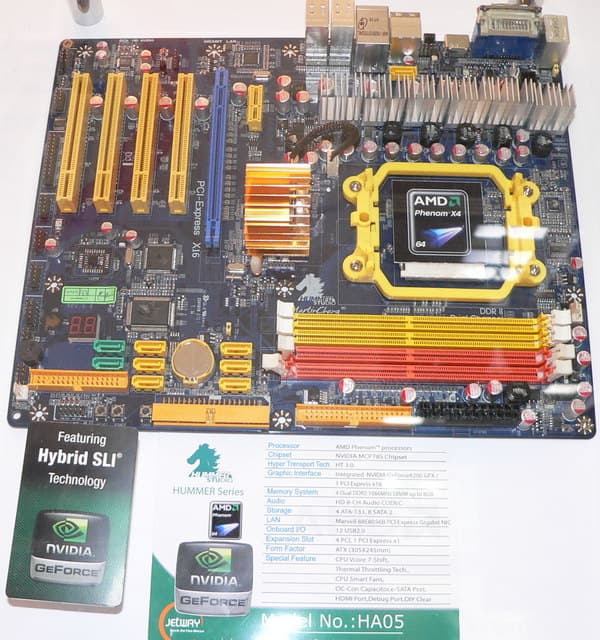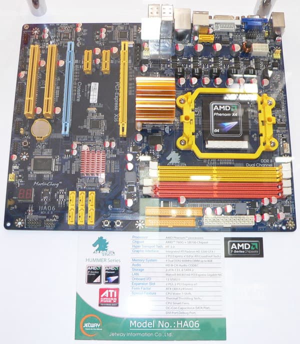 Компания JetWay вынашивает планы по выходу на рынок плат, если уж не высокого класса, то как минимум среднего. Впрочем, и для «высокого» есть платы на соответствующих чипсетах, но будем реалистами — желающих купить плату за $250 на X48 под маркой JetWay надо очень сильно поискать. А для тех, кто выбирает платы не по марке, а по функциональности, есть к чему присмотреться в Hummer Series. В эту серию собраны модели с оригинальным дизайном под авторством некоего Martin Chang, чья подпись даже отпечатана на текстолите таких плат. Модель HA06 представляет собой полноразмерную плату на чипсете AMD 780G, на которой имеются два графических порта и поддержка CrossFire. По сути своей это уже намек на функциональность чипсета 790GX, с той лишь разницей, что при установке двух видеокарт в CrossFire, подключить к рендерингу изображения еще и интегрированное ядро, не получится и, разумеется, между графическими портами пришлось распределить имеющиеся в чипсете линии PCI Express. Ограничения непринципиальные, и оригинальность задумки не вызывает сомнений.