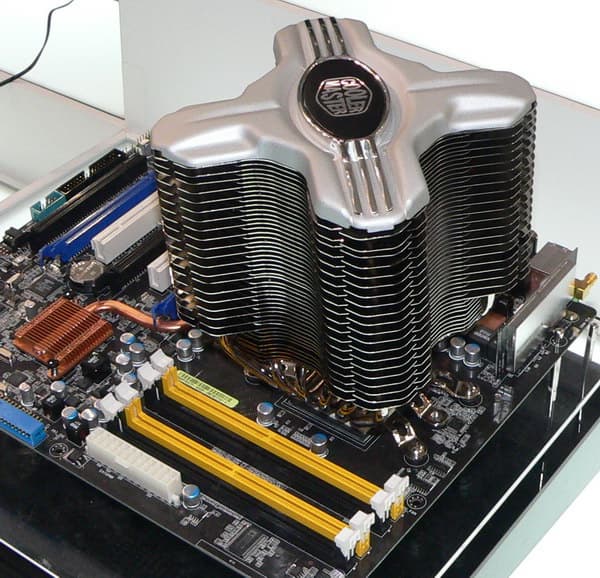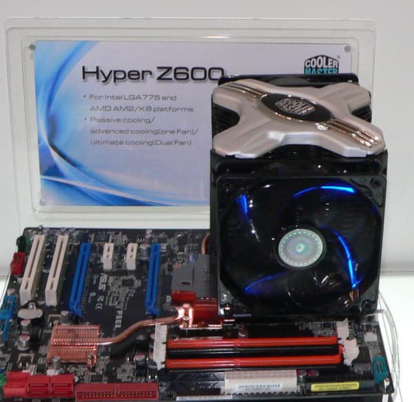 Центральной новинкой стенда Cooler Master среди процессорных кулеров следует назвать Hyper Z600, который хоть и велик, но громоздким не выглядит. А вот вес его (чуть более килограмма) подтверждает статус ультимативного решения, способного охлаждать процессоры с TDP до 89 Вт включительно в пассивном режиме. В конструкции использовано медное основание и 6 тепловых трубок, передающих тепло радиатору из алюминиевых пластин. Как и абсолютное большинство дорогих (и не очень) кулеров, крепление универсальное, подходящее ко всем типам современных процессорных разъемов, так что мы не будем в дальнейшем заострять внимание на этом факте.