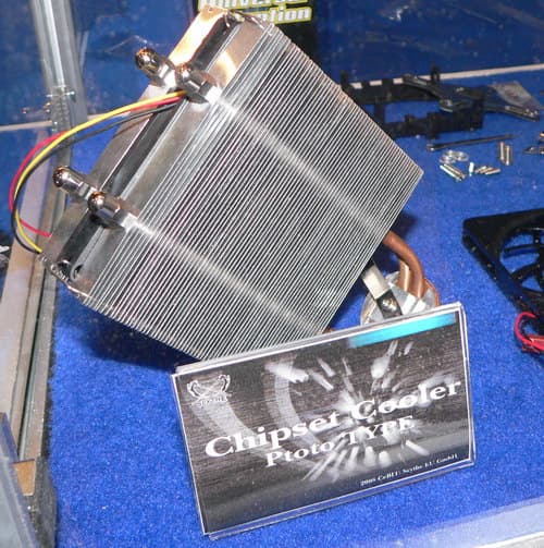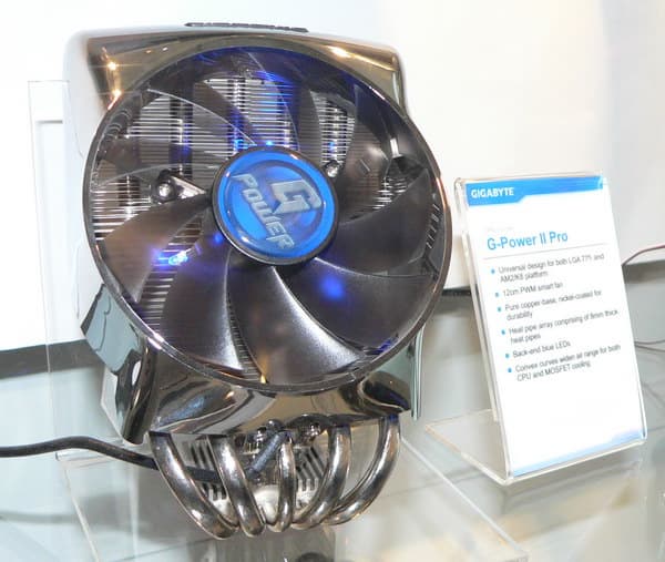 На стенде компании Gigabyte мы увидели кулер G-Power II Pro, о котором ранее рассказывали в новости. Выглядит агрегат несомненно оригинально и сам по себе, а уж по сравнению с выпущенной несколько лет назад исходной версией G-Power Pro и подавно (то был достаточно практичный кулер традиционной компоновки). Расположение радиатора под углом вряд ли сделано из каких-то практических соображений и подкреплено инженерными изысканиями, а вот на размерах самого радиатора и теплоотводящей поверхности эта особенность явно сказалась и едва ли благоприятным образом. Но по внешнему виду сказать: насколько эффективен кулер, мы не беремся, необходимы тесты.