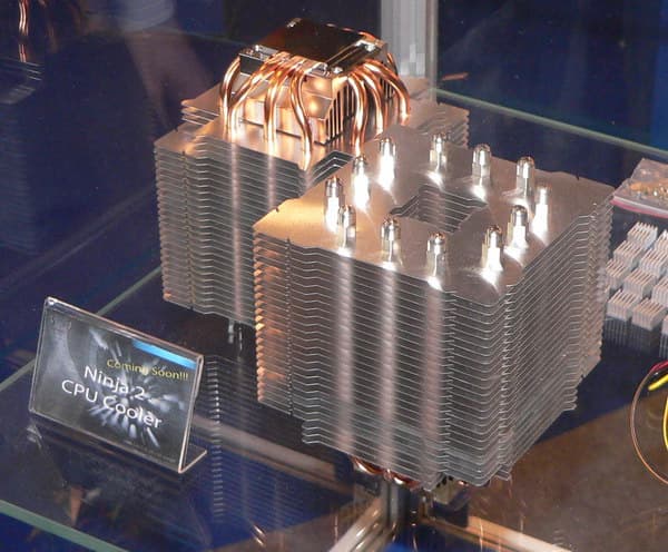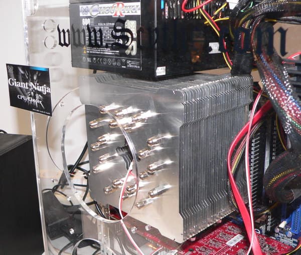 Определение «большой кулер», которое мы применяли к некоторым моделям выше, не даром является относительным. Абсолютное будет звучать так: «самый большой кулер, который только можно поставить в стандартный корпус». И этот кулер мы нашли на стенде Scythe. О каких-то технических характеристиках говорить пока рано, это — прототип и неизвестно попадет ли такой кулер в продажу, но есть ощущения, что в пассивном режиме он просто обязан охладить процессоры и с мощностью 125 Вт. Серьезно говоря, большинству пользователей свободного места в корпусе совершенно не жалко, пусть его занимает хотя бы и такой кулер, лишь бы все компоненты на плату удалось установить. Вопрос возникает лишь в отношении нагрузки на процессорный разъем и плату, поскольку мало весить такая конструкция не может.