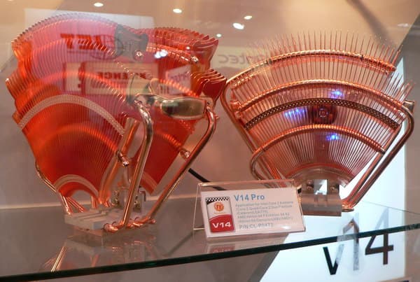 На стенде компании Thermaltake на этот раз экономичные идеи, напротив, были не в чести. А из дорогих нам запомнился гигантских размеров веерообразный V14 Pro. Вероятно, не слишком горячий процессор может охлаждаться и в пассивном режиме, но разработчики установили между двумя «веерами» 140 мм вентилятор с подсветкой.