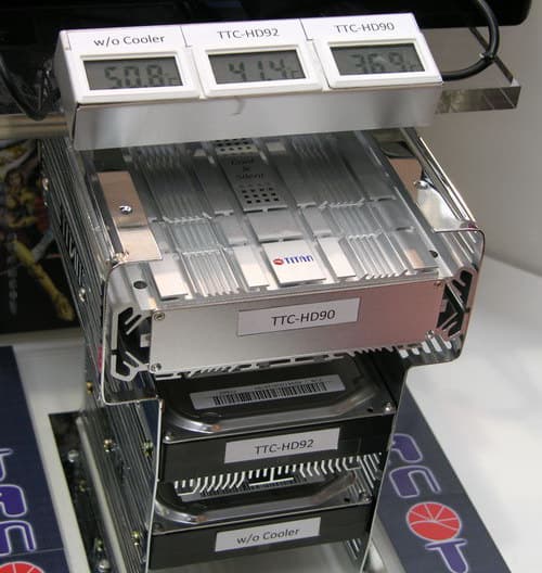 Охлаждением для винчестеров обычно обзаводятся либо самые предусмотрительные граждане, либо те кому уже доводилось в жару обнаруживать дефектные сектора на диске, а то и сгорание электронных компонентов. Известно, что для большинства современных винчестеров 50 градусов является максимальной температурой, допустимой при длительной эксплуатации. Есть также статистические данные, показывающие, что снижение этой температуры до 40 градусов благоприятно влияет на долговечность и позволяет надеяться, что диск прослужит гораздо дольше гарантийного срока. И если в эффективности теплоотводящих алюминиевых корпусов Titan, снимающих тепло со всей поверхности диска, сомневаться едва ли приходится, то результат для новинки — относительно простого радиатора, наклеиваемого на винчестер со стороны контроллера, удивляет. Надо бы потестировать! Впрочем, ноу-хау в данном случае является не столько радиатор, сколько теплопроводящая прокладка, достаточно толстая и эластичная, чтобы обклеить рельеф печатной платы с микросхемами, но очевидно — с высокой теплопроводностью. Причем сцепление с основанием обеспечивается не за счет клейкости, а — особенностей поверхности материала, так что прокладку можно легко отделить, не нарушив товарного вида жесткого диска, и даже использовать многократно.