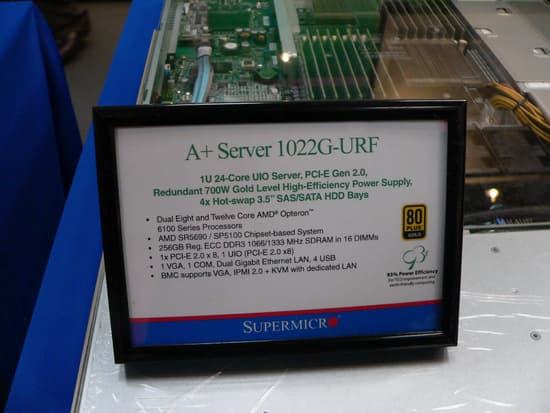 При мысли о многоядерных процессорах ближайшего будущего ноги как-то сами собой привели к стенду Supermicro. Так и есть, пожалуйста, 24 самых что ни на есть физических ядра, уже здесь, в одноюнитовом двухпроцессорном сервере на готовящихся к выпуску 12-ядерных Opteron 6000-серии на ядре Magny Cours.