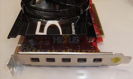 Это видеокарта PowerColor Eyefinity на графическом процессоре Radeon HD5770 с 5 разъемами DisplayPort, о которой мы уже упоминали в новостях. Цену обещают сделать лишь немногим выше стандартной модели с выводом на три приемника. Наверное, в ресурсоемких играх мощности такой карты едва ли хватит чтобы растянуть изображение на 5 мониторов, но в качестве основы для мультимониторной конфигурации для «серьезных» задач такая карта вполне составит конкуренцию специализированным решениям.