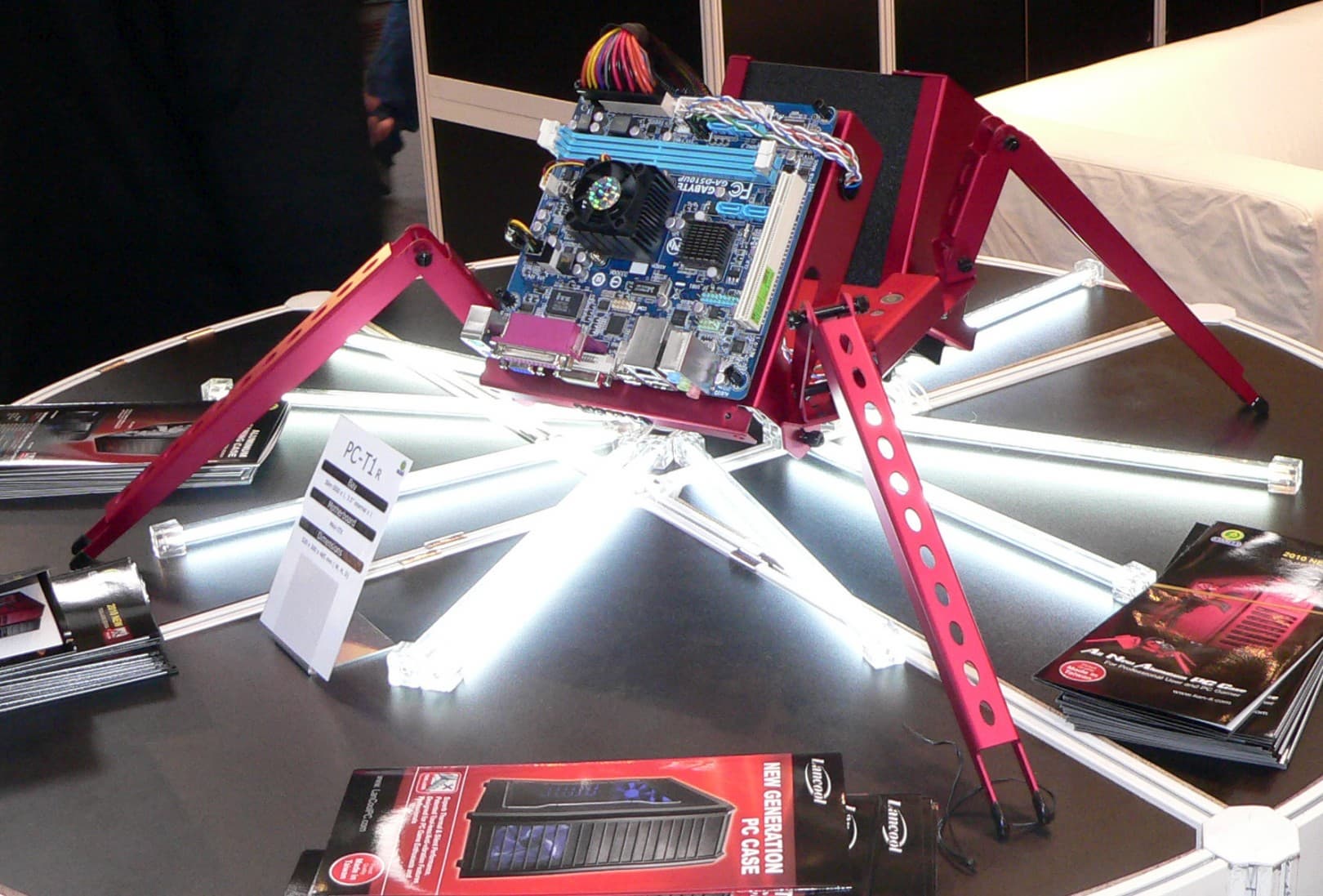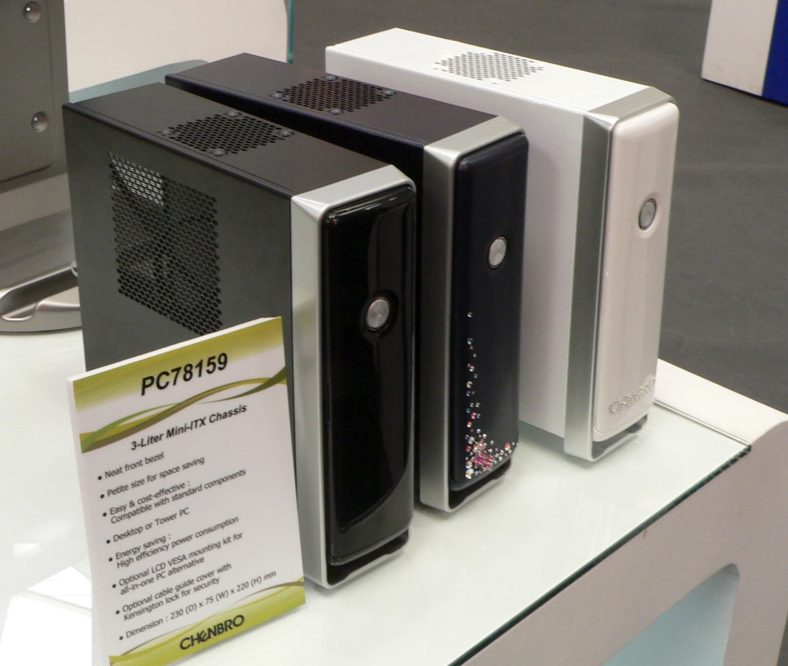 На обратном пути, на флэшке оставалось место еще для нескольких кадров. Почему бы в таком случае не зайти на стенд компании Chenbro? Тем более, что на ее стендах обычно находится место оригинальным изделиям, хотя бы в плане расцветки. Но на этот раз в фокусе внимания оказались устрашающих размеров корпуса для многопроцессорных рабочих станций, а из потребительского сегмента любопытными можно назвать разве что такие 3-литровые Mini-ITX-модели.