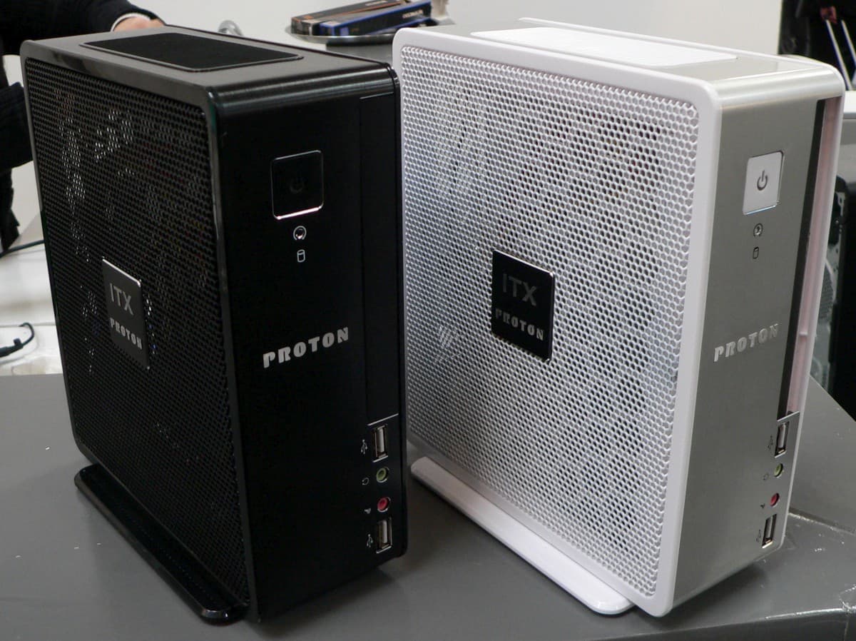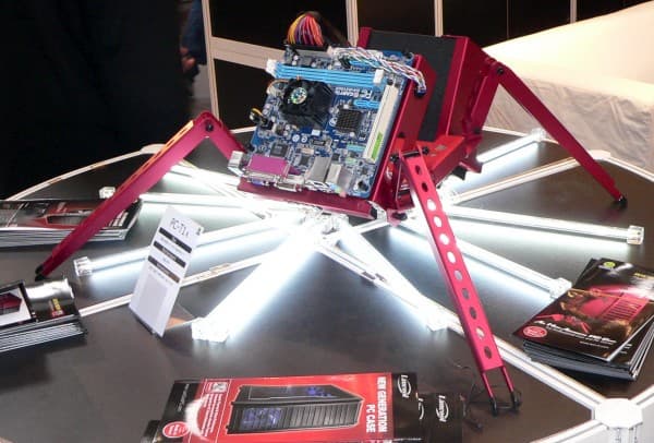 А вот эти mini-ITX-корпуса практически готовы к поставкам. Оптический накопитель тут может быть установлен только Slim-формата, что, в принципе, даже излишество для подобных систем. Ну а вентиляция будет обеспечена за счет решетчатых боковых стенок, и в каких-то случаях пользователь сможет собрать и полностью безвентиляторный ПК. В корпус встроена плата бескорпусного блока питания, к которому подключается внешний преобразователь для питания от сети переменного тока. Скорее всего, будет доступно несколько вариантов по мощности.