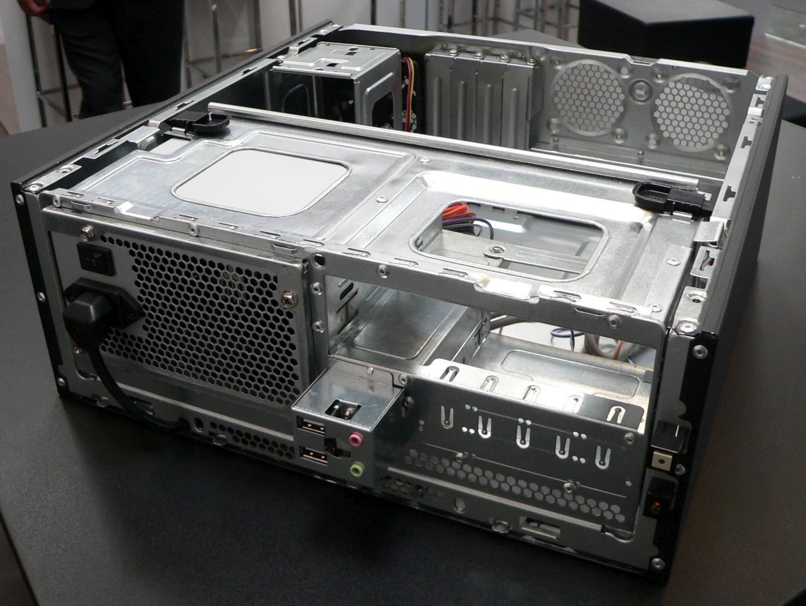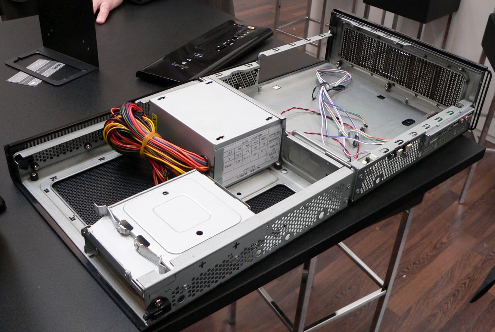 В корпус для платы формата microATX может быть встроен уже полноразмерный оптический привод, но располагаться он будет вертикально. И даже несмотря на это, корпус удивил непривычными пропорциями и габаритами, явно не дотягивающими до стандартных. Секрет раскрывается просто и в самом прямом смысле этого слова.