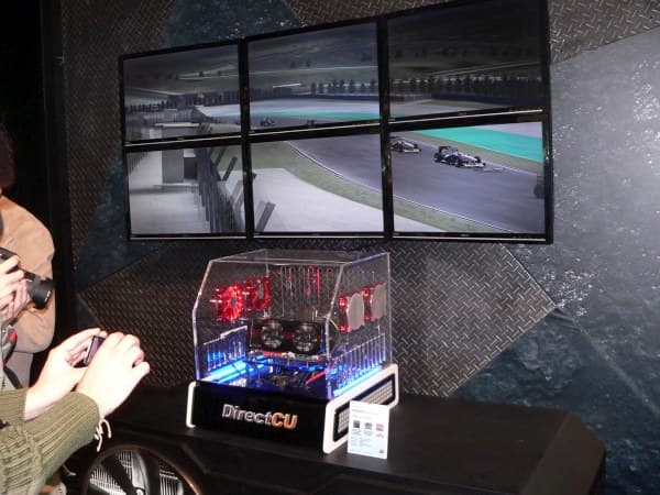 Однако, давайте, перейдем к более привычным для марки ASUS продуктам. Поскольку выход Radeon HD6990 назначен на 8 марта, на выставке эти карты открыто не демонстрировались. В данном случае мы наблюдаем пару HD6970, для которой, конечно же, не составляет труда заставить «летать» изображение на 6 мониторах. От ASUS в данном случае фирменная система охлаждения с заявленной эффективностью на 20% большей, чем у референсного кулера.