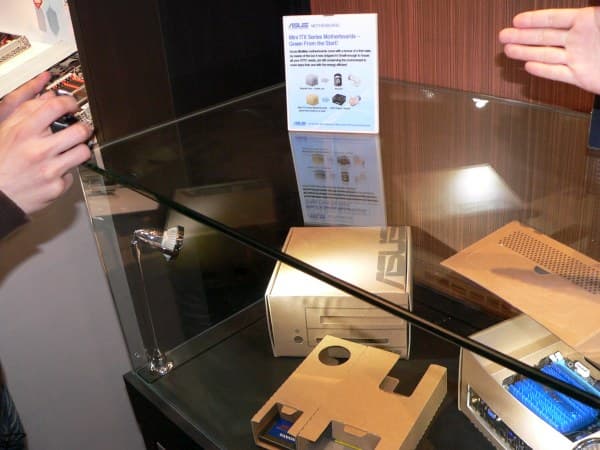 Линейка корпусов ASUS отныне существует под самостоятельным брендом Vento и на выставке представлена не было, а из готовых систем (вернее Barebone) кое-что любопытное присутствовало. Например, вот такая компактная система (объем 10 л) с платой на чипсете AMD 780L подойдет не только для повседневных вычислений, но и в зависимости от установленного процессора, роль которого может играть любой из линейки Athlon II и Phenom II, может послужить и для воспроизведения Full HD.