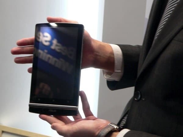 Переходим к планшетам. На фотографии модель-середнячок по габаритам и возможностям под названием Eee Pad Slider. В стационарном положении это обычный планшет на «андроиде», однако есть выдвижная клавиатура, превращающая его в подобие ноутбука. В качестве платформы используется NVIDIA Tegra2, имеются две камеры (1,2 и 5 Мп) и встроенный 3G-модем. Весьма приятное впечатление оставил 10,1-дюймовый IPS-экран.