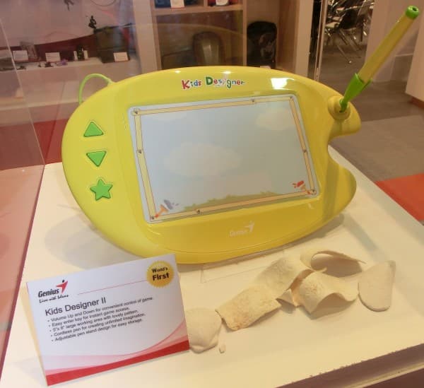 Вернемся к стенду Genius, чтобы обозреть «первый в мире» Kids Designer II. Это планшет (не планшетный компьютер! вспомните, что это слово изначально относится к устройствам перьевого ввода), и помимо детского дизайна, ориентацию поддерживает комплектное ПО, в которое входят обучающие игры.