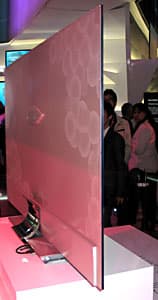 Для тех, кто не заметил, — на первой фотографии телевизоры с необычайно тонким обрамлением вокруг экрана, а на второй толщина телевизора 6,9 мм!!! И если к тонкому обрамлению мы уже как-то привыкли с компьютерными мониторами, хотя для телевизоров это ещё в диковинку, то толщина телевизора 6,9 мм, позволяющая повесить его действительно как картину на стену для меня была культурным шоком. Да ещё в сочетании со спотовой LED-подсветкой. Конечно, в магазины такой экран пойдёт в некотором обрамлении с динамиками по бокам или внизу и толщина увеличится, но как было бы здорово иметь такой экран с минимумом пластика для использовании в домашнем театре, когда не волнуют ни тюнер, ни встроенные динамики.